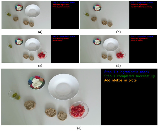 The process of checking for the correct ingredients: (a) tomatoes missing, (b) plate and tomatoes missing, (c) ntakos missing, (d) ntakos and oil missing, (e) all the ingredients are present.