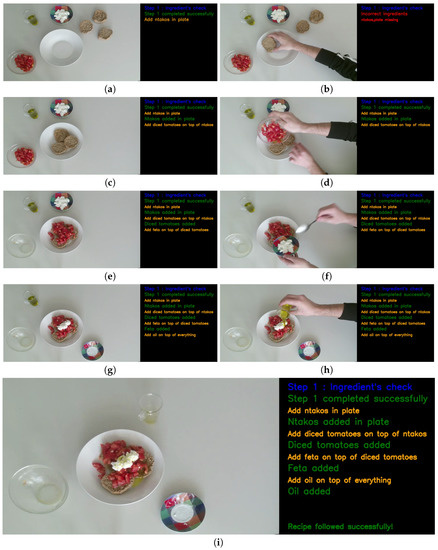 By acquiring the correct ingredients/utensils (see Figure 11), the user can proceed in the realization of the recipe. The ingredients are added one at a time, more or less like in real life. The first message that pops up on the screen is to add ntakos to the plate (see Figure 12a). The user moves the ntakos to the plate (see Figure 12b) and the cooking assistant calculates if the procedure is done accordingly to the plan. The message that pops up on the screen is “Ntakos added in plate” as well as the next message, which is to add the next ingredient. In this case, it is “Add diced tomatoes on top of plate” (see Figure 12c). After adding tomatoes on top of ntakos successfully, the messages inform the user about the outcome and instructs them to add the next ingredient, which is Feta (see Figure 12e). In the same manner, Feta is added on top (see Figure 12g) and lastly oil on top of everything (see Figure 12i). Due to the fact that adding oil was the final step, a message pops up, informing the user that the recipe was executed successfully.