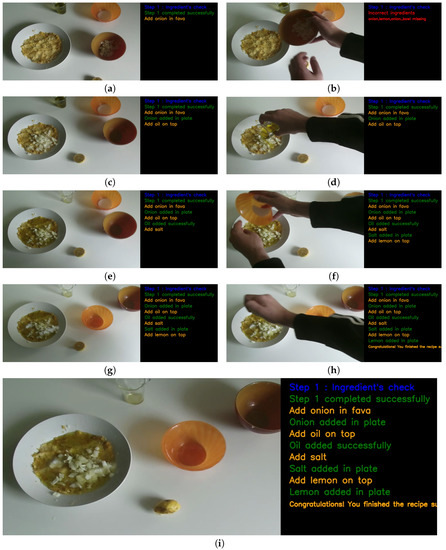 Cooking procedure of fava: (a) first step: add onion, (b) moving onion; (c) second step: add oil, (d) moving oil; (e) third step: add salt, (f) moving salt; (g) fourth step: add lemon, (h) moving lemon; (i) successful execution of the recipe.