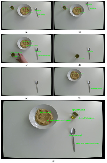 The spatial arrangement of objects at successive frames: (a) initial state, (b) spoon has been moved but is still in the right of the plate, (c) both oil and spoon have moved downwards, (d) plate has been removed from the scene and the labels have adapted, (e) only the spoon appears in the scene so no information is shown, (f) plate has reappeared, (g) all three objects are in the scene and appropriate relative positions are shown.