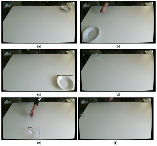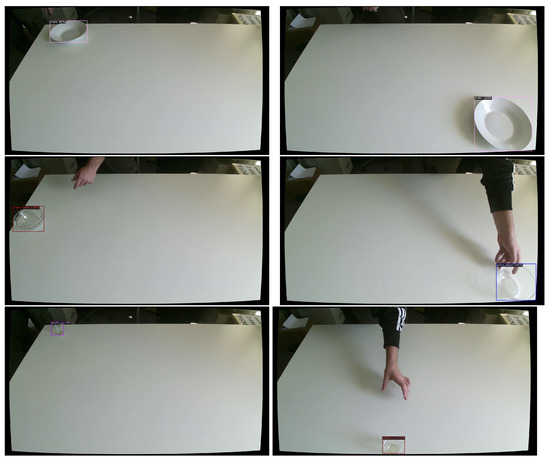 As shown in Figure 16, two of the objects were transparent, which added extra complexity but at the same time manifested the necessity of training a custom object detector. Figure 16 cements some of the notions discussed here. Overall, the precision of the pre-trained model was very poor. The average precision was 5.7% for the cup, and 0.0 % for the glass bowl and the plate. On the other hand, the performance of the custom object detector was outstanding in all three of the objects and in most of the cases. Even though detecting a transparent object or even a white plate on a white table remains an intractable task, the custom detector achieved high scores. The detector achieved 98.812% true positives for the plate, 95.198% for glass bowl and 83.647% for plastic cup, succeeding in all three of the criteria, which fulfills the “true positive” classification: confidence score > threshold. The predicted class matches the class of a ground truth; the predicted bounding box had an IoU greater than the threshold (e.g., 0.5) with the ground-truth. Figure 17 shows some of the successfully annotated instances of the custom detector. Although it is understandable that training a detector on these custom objects is beneficial over the off-the-shelf detector, at the same time, it is also experimentally confirmed that such detector performed poorly in a real-world situation. Therefore, we conclude that even if a detector was trained on a very large and diverse dataset, possibly including all categories of interest, there is not prospect for direct application and we suggest training a detector on a custom dataset.