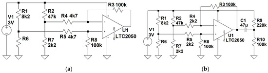 As previously stated, the Wheatstone bridge is one of the typical circuits used for resistance measurement. Its output can be amplified by a differential amplifier, forming a circuit presented in Figure 2a. An instrumentation amplifier can also be used if a higher CMRR (Common Mode Rejection Ratio) is desired [34]. While the basic Wheatstone bridge is a good method of measuring resistance, when it comes to respiration signal extraction there are certain features of the signal that must be considered. To evaluate the performance of the basic architecture, a circuit consisting of the Wheatstone bridge, followed by a differential amplifier, was constructed in the LTspice software (Analog Devices, Wilmington, MA, USA) as shown in Figure 2a.