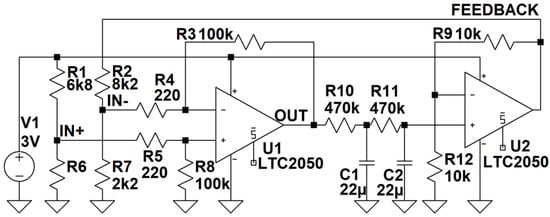 The previous simple differential amplifier configuration has been changed to include a second-order low-pass filter, formed by C1, R10, C2, and R11. The filter characteristic should block the respiration signal, passing only DC offset to the next stage. Then, the non-inverting amplifier U2 is utilized to form the feedback signal that supplies the IN− branch of the differential amplifier stage. With the assumption that , , and substituting the DC component of the output signal (i.e., the signal offset) is given as in Equation (1).