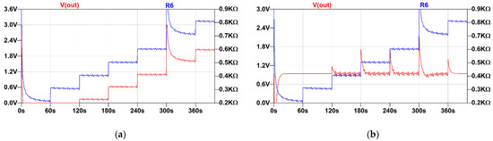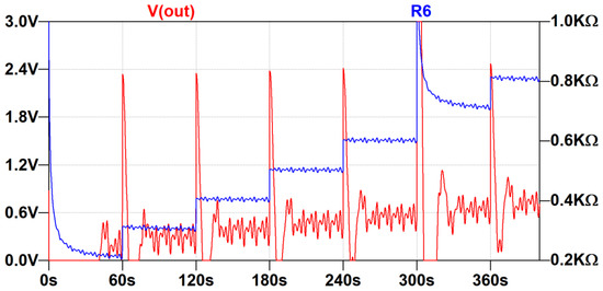 The proposed low-frequency feedback topology has also been simulated using the LTspice software. The sensor was represented by a resistor, the same as was used in the simulations of the circuits in Section 3.1.1 and Section 3.1.2. The output from the simulation is shown in Figure 5. The blue trace represents the resistance changes and the red one is the output produced by the circuit.