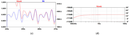 Output signals of the standard resistance measurement circuits (LTspice). The red trace is the output and the blue trace represents the input resistance, if applicable. (a) Differential amplifier circuit; (b) Differential amplifier with high-pass filter; (c) Enlarged view of the signal before and after the high-pass filtering; (d) AC analysis of circuit with the high-pass filter.