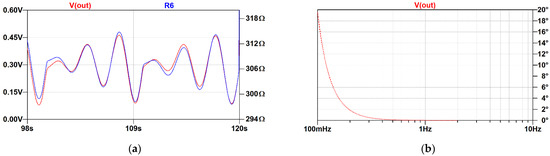 An enlarged part of the same graph is presented in Figure 6a. This figure shows that no significant phase shift is introduced to the signal by the proposed circuit. Also visible on the graph are slight nonlinearities around resistance discontinuity points, for example at 110 s. They are inherent in such configuration, but as was mentioned before, they do not pose a serious problem in sleep apnea detection. Nevertheless, these nonlinearities are probably the main drawback of the presented architecture. Additionally, a phase analysis graph obtained from LTspice is presented in Figure 6b. The plot confirms that the proposed circuit does not introduce any significant phase shift into the signal. At 0.3 Hz, the phase shift is about 0.5 degrees. This can be further reduced by changing the RC values in the low-pass filter.