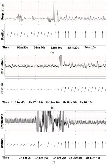 The above graphs show moments when the patients changed their positions during sleep. In the first two cases (Figure 8a,b), the position changes caused the respiration graphs to be unreadable due to the settling time of the RC filter. In both cases, this took almost 30 s, but eventually the circuit converged to a state where the device was able to sample the respiration signal correctly again. In Figure 8c, there are heavy motion artifacts present, after which the circuit establishes a new operating point and respiration is recorded correctly again.