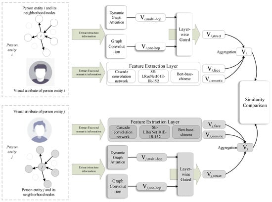 With the emergence of a large number of multimodal data such as images, videos and voice data, multimodal knowledge graphs have become an important aspect of the development of knowledge graphs. For example, RichPedia [4] and other multimodal knowledge graph datasets have shown that they are far more abundant and complete than unimodal knowledge graphs and have significantly improved the universality of knowledge graphs and the effect of various downstream tasks. Therefore, work based on multimodal knowledge graphs has become a research hotspot in recent years. The task of multi-entity alignment is divided into two subtasks: the alignment of text entities with visual entities and multi-attribute entity alignment. The alignment of text entities with visual entities is similar to the task of image–text matching, and the joint representation is obtained by using a multi-pretraining model or multi-objective iterative training. Multimodal attribute entity alignment methods mainly fuse visual information and text information in the entity attributes to transfer the visual and text features to the common vector space and learn the multi representation of the entity to calculate the similarity [5]. However, the semantic span between the visual facial information, the text modality attribute and relationship information is large, and it is difficult to model it into the same semantic space using the multi-pretraining model. Therefore, most current person entity alignment methods only use attribute and relationship information and ignore image information. As a unique biometric attribute of person entities, human facial information has obvious advantages in distinguishing between different person entities and the task of person entity alignment. However, due to the sparsity of facial attributes in the person relation graph and the complexity of open scene face recognition, a large amount of effective triplet information will be lost if person entity alignment is performed by using face alignment alone, resulting in a poor alignment effect. Therefore, this paper attempts to strengthen structural representations through facial and semantic information, so as to improve the accuracy of person entity alignment.