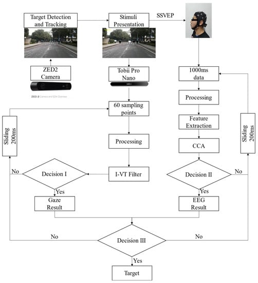 The purpose of this study is to evaluate the performance of a multi-modal BCI that combines eye-tracking and SSVEP for pedestrian tracking and selection. First, the ZED2 camera collects real-time video of driving foreground road conditions and performs multi-target detection and tracking. The coordinates and IDs of the pedestrians are transmitted to the remote computer through the LAN. Second, flashing arrows of different stimuli appear on the targets after receiving data, and follow their movements. The arrows point to a random distribution. After calibrating the eye tracker, participants gaze at the stimulation interface. The eye tracker and the EEG acquisition instrument begin to collect the corresponding signals at the same time. The flow of online signal processing is shown in Figure 1. The sampling frequency of the eye tracker is 60 Hz. In the processing of eye-movement data, I-VT filter is introduced to process visual trajectories. Decision I: When the confidence of the trajectory change over 60 consecutive sampling points exceeds 70%, the result {r1, r2…} of eye-tracking is output. In the processing of EEG signals, the canonical correlation analysis (CCA) algorithm performs feature extraction on 1000 ms of EEG data and outputs the maximum correlation coefficient (ρ). Decision II: Output the result {s1} of EEG selection when ρ exceeds the pre-set threshold. Decision III: Output selection target when {r1, r2…} ∩ {s1} ≠ ∅. Otherwise, no result output is considered an idle state. Slide the window forward 200 ms to acquire eye-tracking data and EEG data for the next 1 s and process until the target result is output.