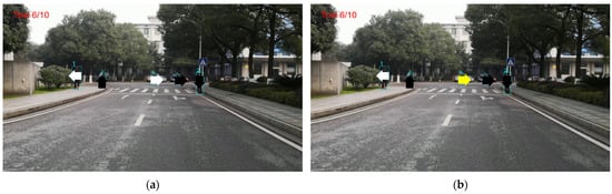 Stimuli presentation interface of hybrid BCI system on trial 6 of a block. (a) Arrows in different directions are randomly superimposed on pedestrians according to the frequency list corresponding to the ID order; (b) Subjects select the threatening object, and the arrow stops flashing and turns yellow.