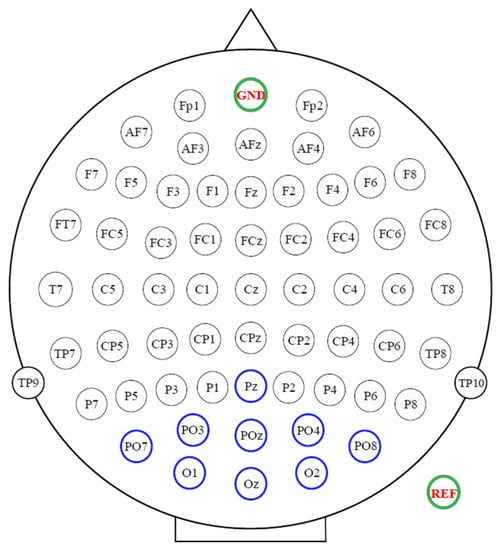 A 64-channel extended international 10/20 system was used to record the EEG signals in this experiment. Figure 4 shows the placement of 9 electrodes for EEG collection, which were placed in Pz, PO7, PO3, POz, PO4, PO8, O1, Oz and O2. The reference electrode was placed behind the right ear, and the ground electrode was placed on the forehead. Before data acquisition with BrainAmp DC amplifier (Brain Products GmbH, Germany), the impedance of each electrode was reduced to less than 10 kΩ. The sampling frequency was 200 Hz and was filtered by a 4–35 Hz bandpass and notch at 50 Hz. BCI2000 [] served as the control platform to collect EEG signals, the PyGame [], a Python expansion package, presented the stimuli interface, and MATLAB was responsible for real-time signal processing. The display interface and the control platform were connected through the TCP/IP protocol.