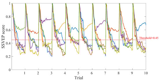 Since the SSVEP responses of the participants are individually different, a specific threshold is set for each participant. Ten correct choices of each subject in the offline experiment are randomly selected to calculate the SSVEP response score, and the minimum value is taken as the threshold. As shown in Figure 5, the SSVEP response scores of S5 in 10 correct selection tasks are 0.6387, 0.5647, 0.7696, 0.7065, 0.5630, 0.6896, 0.7323, 0.5981, 0.4541, and 0.6721, respectively. In addition, the minimum response score (0.45) is set as the threshold for Subject 5. The SSVEP response scores of the 6 subjects in the random correct selection tasks for ten times are shown in Table 1, and the statistical thresholds are 0.56, 0.62, 0.51, 0.47, 0.45, and 0.39, respectively.