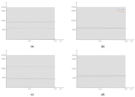 The change of eye movements during saccade in the direction of arrows. (a) Top-to-bottom saccade; (b) Bottom-to-top saccade; (c) Right-to-left scanning; (d) Left-to-right saccade. The blue line represents the change in the x direction and the orange line represents the change in the y direction. The distance between the two gray lines is 60 pixels.