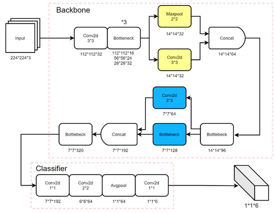 In Figure 2, there is a mark of *3 on the first Bottleneck. This means that there are three Bottleneck operations there. Each operation in the figure has data to mark the current feature map size, and Conv2d boxes refer to convolution kernels. In the figure, the background colors of the squares are marked as yellow and blue, which are the fourth and sixth Bottleneck structures that were replaced, as mentioned above.