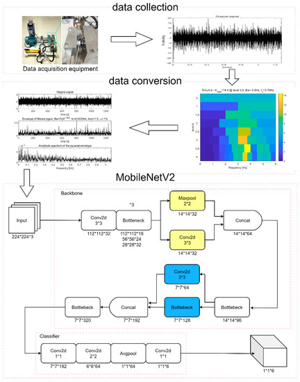 The process of the method proposed in this paper is shown in Figure 5 below, which consists of three parts: data collection, data conversion, and fault classification based on MobileNetV2 network.
