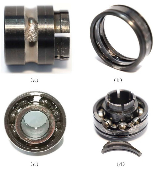 Figure 9 shows the bearing pictures of typical failure types, from which it can be seen that the failure causes of the tested bearings include inner ring wear, cage fracture, outer ring wear, outer ring cracks, etc.