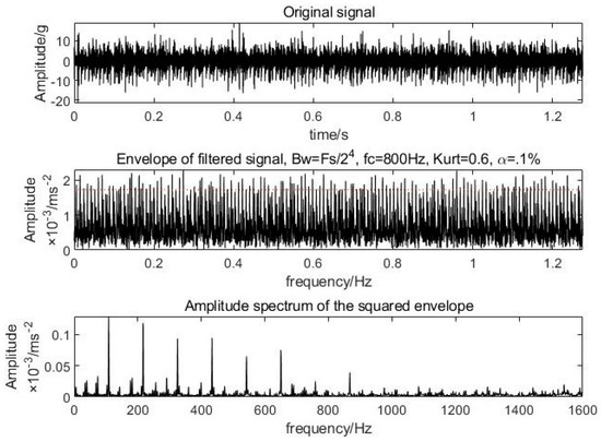 Figure 12 shows the result of fast spectral kurtosis processing. From top to bottom, the figure shows the original signal, the envelope spectrum calculated by Hilbert transform, and the squared envelope spectrum of the signal obtained after bandpass filtering.