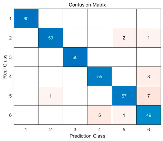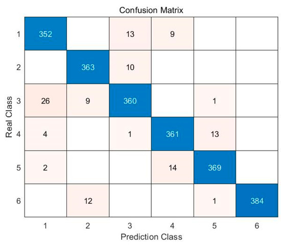 In order to strengthen the convergence ability of the network, the parameter initialization of the MobileNetV2 network adopts the method of transfer learning, using the weight values pretrained on the ImageNet [13] dataset. The pooling method of the MobileNetV2 network is global average pooling and the optimizer is an adaptive moment estimation optimizer. The learning rate was initialized to 0.001, the cross-entropy function was sampled as the loss function, and the processing volume per batch was 15. The confusion matrix representing the training results is shown in Figure 13.