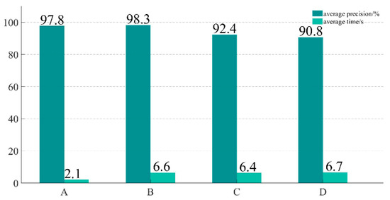Figure 16 shows the average accuracy and average time-consuming statistics of each model in the test set of the experiment 10 times. In the figure, A is the method in this paper, B is the Xception experiment result, C is Resnet-50, and D is DenseNet-121. From the figure, the accuracy and recognition time of each model can be seen intuitively. It can be seen from the above experiments and analysis that the method proposed in this paper has excellent effectiveness and generality in the field of fault identification.