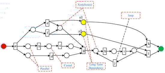 At present, most process discovery methods cannot discover indirect dependencies between activities, such as long-distance dependencies [15] (such as S1 and S2 in Figure 1). The behavior profile uses the weak order relationship between activities to describe the behavior dependency relationship among activities, involving strict order relation, exclusiveness relation, and interleaving order relation [30]. Among them, the exclusiveness relation is the strictest relationship, indicating that two activities cannot appear in any trace at the same time. However, the behavior profile only describes the behavior dependency between activities and cannot capture the actual occurrence dependency and causal dependency of activities in the actual business process, i.e., whether the occurrence of one activity will affect the occurrence of another activity and vice versa.