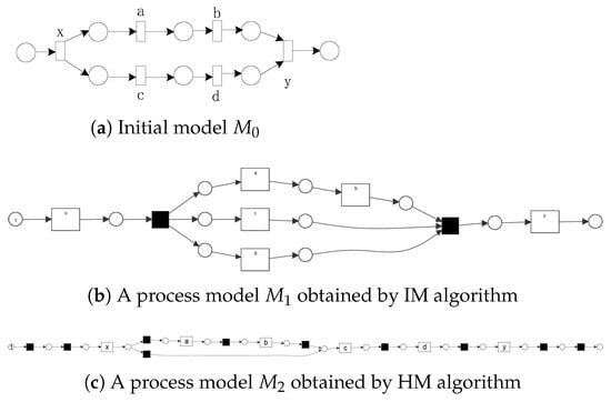 Another problem is that the event log represents the behavior that has been observed during the actual operation of the system and cannot contain all possible behaviors of the system. Thus, the log is often incomplete. One of the problems faced by process discovery is that the log cannot contain enough information to discover a process model, i.e., the log might be incomplete [29]. This might cause the discovered process model to exclude the actual behaviors or contain some additional behaviors that are not in the real process. The existing process mining usually assumes that either the activities are complete or the directly-follows relationships between activities are complete. However, when there exist high concurrency behaviors, the second assumption is often unrealistic. For example, a process consists of 10 concurrent activities, and the log consists of about 10,000 cases. There are 10! = 3,628,800 possible sequences caused by concurrent behavior. Obviously, the number of cases in the log is far less than the actual possible sequence, so it is impossible that the log samples all possible directly-follows relationships between activities. There are many factors leading to logs being possibly incomplete. However, cycles and high concurrency are important factors. When the number of activities on concurrent branches is large, it is impossible for the event log to sample all possible sequences of activities. Figure 4a shows an initial process model of each concurrent branch containing two activities. An incomplete event log is generated by the model , where .The process model obtained by applying the IM algorithm and the HM algorithm to the event log is shown in Figure 4b,c. The precision of the model is 1, and the fitness is low. The fitness and precision of the model are both 1, but this model is overfitting. Therefore, incomplete logs caused by concurrency will lead to low-quality process models or even erroneous results.
