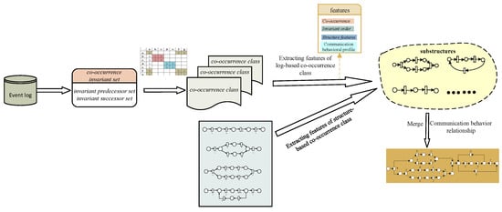To solve the above problems, a method for discovering the process model from incomplete logs is presented. We adopt the technology of combining behavioral profiles and co-occurrence classes to analyze the structural characteristics and communication behavior relationships of co-occurrence classes, then merge several co-occurrence classes into a larger substructure to find the process model. The research framework of the proposed method is shown in Figure 5. The proposed method solves the problem that behavior profiles cannot capture the occurrence dependency between activities and the incompleteness caused by high concurrency. The experimental results show that the proposed method can find long-distance dependency, and the discovered process model has a good consistency with the original model.