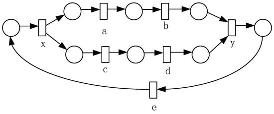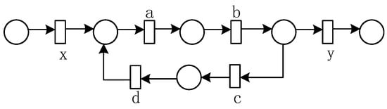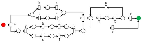 Until now, a series of process mining methods have been proposed, mainly including a directly-follows relationship between activities [7], domain-based theory [8,9,10,11], genetic-based algorithm [12,13], frequency-based technology [14,15,16], cut-based technology [17], abstraction-based technology [18], and so on. Of these, the method based on the directly-follows relationship between activities can only find some subclasses of Petri nets and cannot guarantee soundness and fitness, such as the algorithm [19] and its derivatives [20,21,22]. The technique of domain-based theory mainly includes language-based domain miners [8], state-based domain miners [9], and integer linear programming (ILP) miners [10,11]. Although these methods guarantee the fitness of the model, they cannot guarantee the soundness of the model. The mining method based on the genetic algorithm iterates the process model until the acceptable quality is obtained. It selects the fittest individuals and generates new individuals using two genetic operators, such as crossover and mutation [12,13]. Although the process model obtained by this method has good fitness, it consumes a great deal of running time and cannot guarantee the soundness of the model.
