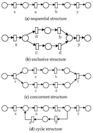 (1) Concurrent substructure: It is known that , if exists activities , where , , , and holds, then corresponding to and-split and and-join activity respectively. If not exist or such that or , then and-split or and-join are hidden transitions. Meanwhile, , , holds, then the typical substructure of and is shown in Figure 9.