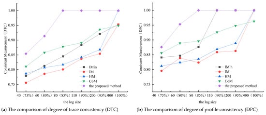 Figure 13 shows that the IM algorithm and the HM algorithm require that the event log is complete with a directly-follows relationship, and IMin, COM, and the proposed method can handle an incomplete event log. Although the IMin method can handle the incompleteness of the event log, it cannot discover the long-distance dependency; thus, the value of DTC is lower than that of DPC between the model discovered by IMin and the original model. IMin mainly retains the behavior relationship with high probability based on the directly-follows relationship between activities to determine the behavior between the activities. Hence, the requirement for completeness of IMin is lower than that of the IM and HM algorithms but is higher than the proposed method and the CoM method. The proposed method and CoM method require that the completeness degree of the log is up to 85%. However, because the CoM method has some limitations in discovering the cycle structure, the consistency degree between the discovered model and the original model cannot reach 1, even if the log completeness degree is more than 85%. IMin requires the completeness ratio of the log to be about 90%. However, since the process model discovered by IMin is block-structured, some hidden transitions can be added when building the model. These hidden transitions may cause the model to generate additional behaviors, which may lead to a certain deviation between the discovered model and the original model. Thus, for the IMin method, even if the log completeness ratio reaches 90%, the consistency degree between the discovered model and the original model is still less than 1.