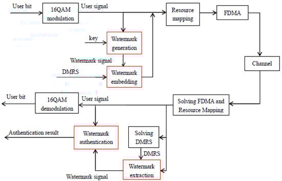 This paper mainly studies the physical-layer uplink shared channel (PUSCH) in a 5G system. In a 4G LTE system, to reduce the peak-to-average ratio of the system, the multiple access mode used by the PUSCH is SC-FDMA instead of OFDMA, whereas in a 5G system, these two multiple access modes are applied simultaneously [17]. The signals in the PUSCH can be divided into users’ signals and the DMRS. According to 5G protocol, the base sequence format of the DMRS is different according to the multiple access mode and the number of subcarriers, which can be divided into three categories: the base sequence applied to OFDMA, the base sequence applied to SC-FDMA with no fewer than 36 subcarriers, and the base sequence applied to SC-FDMA with no fewer than 36 subcarriers [18]. In the third case, this paper designs a watermarking scheme and assumes that the modulation mode of the user’s signal is 16-ary quadrature amplitude modulation (16QAM). The system model after embedding the watermark is shown in Figure 1.