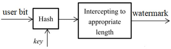 If the embedded watermark bits are the same in each data frame, the watermark can be easily obtained by other receivers. Therefore, to implement identity authentication, the basic watermark generation method is to determine a common key, then hash the key with the user bits, and take the hashed result as watermark bits [19]. The watermark generation scheme can be shown in Figure 2. An interception step is added after the hash operation to get the appropriate watermark length. The hash algorithm used in this paper is SHA-1 [20].