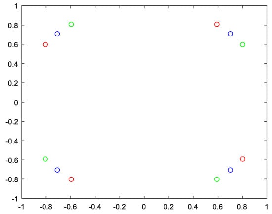 To solve the above problems, in this paper, channel coding is added to the watermark generation scheme, and the receiver can increase the accuracy of watermark extraction through channel decoding. In this paper, (7, 4) cyclic code is used as the channel coding method of the watermark signal [22]. In addition, when the modulation scheme adopted by the user’s signal is 16QAM, there are three different amplitudes, so the user bits can be replaced by the modulus of the user’s symbol as the input of hash encryption, as shown in Figure 6. In Figure 6, blue represents the user bits as the input of the hash, and red circles represent the moduli of the user symbols as the input of hash encryption.