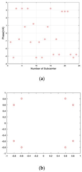 where is the embedded watermark signal, a is the embedded strength, w(n) is the watermark bit embedded in the nth subcarrier, and its value is . y(n) is the base sequence of DMRS after embedding the watermark. The constellations are shown in Figure 3.