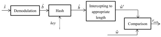 In addition to extracting the watermark from the transmission signal, the receiver needs to regenerate the watermark to complete the authentication. The receiver and the sender share the key, and at the same time, the receiver can demodulate the user bits , then hash the key and the user bits , and intercept the hashed result to an appropriate length to regenerate the watermark bit . Finally, according to whether the watermark bit generated by the receiver, , is the same as the watermark bit extracted by the receiver, , it is determined whether the authentication is successful:
