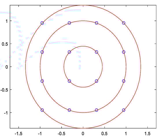 When the user bits are used as the input of hash encryption, it must be ensured that every point on the constellation can be correctly judged. When the modulus of the user’s signal is used as the input of hash, one only needs to ensure that the judged modulus is equal to the real modulus. Obviously, by using the modulus of the user’s signal instead of the user bits as the input of the hash algorithm, the authentication error caused by the transmission error of user bits can be reduced. It is worth noting that the three moduli in 16QAM are not uniformly distributed. In Figure 6, the three moduli are 0.4472, 1, and 1.3416 in turn, which are denoted as , and , and their differences are 0.5528 and 0.3416. It can be seen that the difference between the larger two moduli is small, which may confuse one when judging the modulus. The ultimate goal of the watermark generation scheme is to generate different watermarks for different data frames, so it does not emphasize the accurate judgment of modulus, and only needs the changing of the modulus in different data frames. To improve the accuracy of the judging modulus, two larger moduli can be regarded as the same situation and then distinguished from the smallest modulus. In this paper, the distinguishing modulus is defined as the pseudo-user-bit, and the formula is as follows: