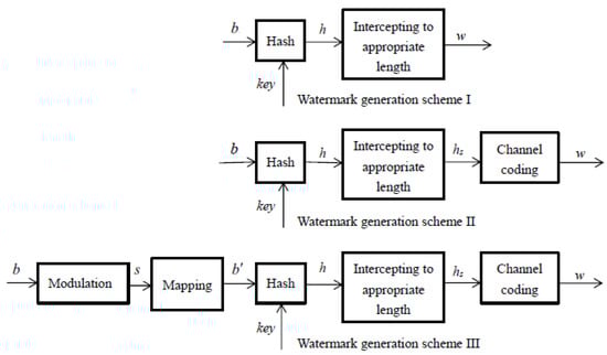 Watermark generation schemes. Scheme I is the basic watermark generation scheme, Scheme II adds channel coding on this basis, and Scheme III uses the pseudo-user-bit instead of the user symbol as the input of the hash algorithm.