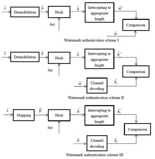 Watermark authentication schemes for scheme I, scheme II and scheme III.