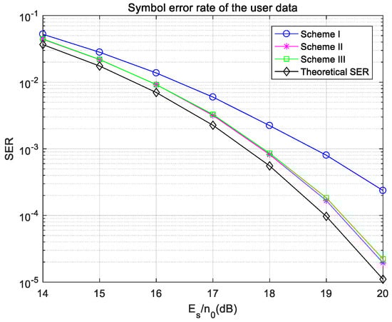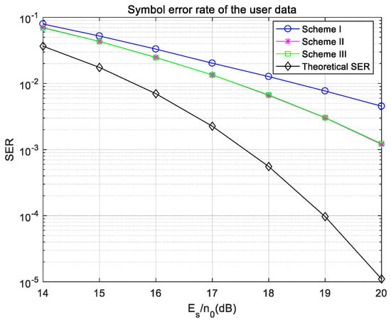 In Figure 9, the symbol error rates of user signals in Scheme II and Scheme III are consistent, and both are similar to the theoretical symbol error rate of 16QAM, lower than that in Scheme I. This is because the watermark signals in Scheme II and Scheme III meet the requirement of symmetry, so when using DMRS to estimate the channel, the results in Scheme II and Scheme III are more accurate and cause less interference with the user signals, so the symbol error rates of user signals are lower. The difference between Scheme II and Scheme III is that the input of hash operation is different, so it has little effect on the user’s signal, and there is no difference in the symbol error rate of the user’s signal between the two schemes. In Figure 9, compared with the theoretical symbol error rate of 16QAM, there is still a gap in the user’s signal error rates in Scheme II and Scheme III, because channel estimation of the DMRS is not completely accurate.