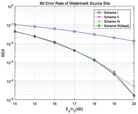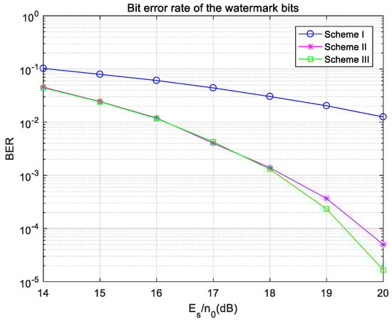 Figure 10 shows the transmission bit error rate of watermark bits. In Figure 10, the bit error rate of the watermark bits in Scheme I is higher than those of Scheme II and Scheme III. This is because channel coding can be used for error detection and correction at the receiving end. It can be seen that the performance of the watermark in the transmission process is improved by using channel coding, which can not only avoid interference to channel estimation but also correct errors at the receiver.