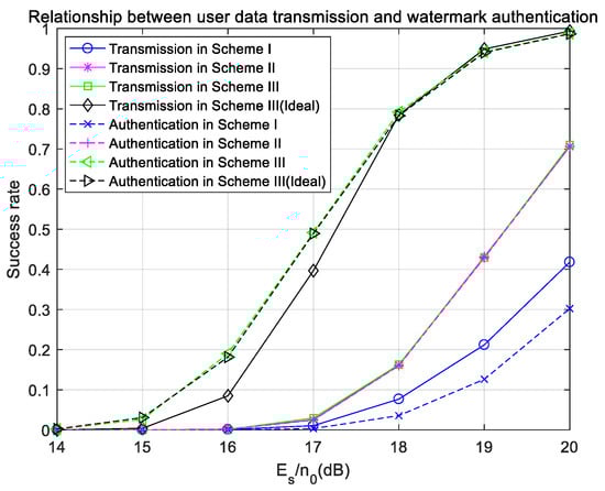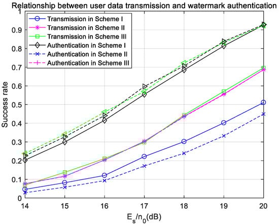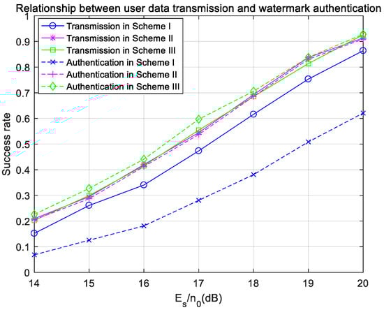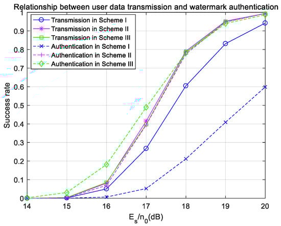 The success rates of user-data transmission and the success rates of watermark authentication in three watermarking schemes are compared in Figure 11. In Figure 11, the success rates of user-data transmission in Scheme II and Scheme III are the same and higher than that in Scheme I, which is due to the symmetry of watermarks in Scheme II and Scheme III. The success rate of watermark authentication in Scheme I is far lower than that of user-data transmission. As the channel coding process is absent in Scheme I, the receiver cannot correct the watermark. Even if the user data are successfully transmitted, the authentication may fail because of the error of watermark-bit transmission. The success rate of watermark authentication in Scheme II is very close to the success rate of user-data transmission because channel coding is added in Scheme II, so the transmission accuracy of the watermark is greatly improved compared with Scheme I. In Scheme III, the success rate of watermark authentication is consistent with the success rate of user-data transmission. Even when the signal-to-noise ratio is low, the authentication rate is higher than the success rate of user-data transmission, because pseudo-user-bits are used instead of user bits as the input of the hash algorithm in Scheme III. Even if some user’s signals are demodulated incorrectly, as long as the mapped pseudo-user-bits are correct, the same watermark source bits can still be generated to complete watermark authentication. Therefore, when the success rates of user-data transmission in Scheme II and Scheme III are the same, the authentication success rate in Scheme III is sometimes higher than that in Scheme II.