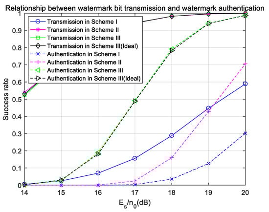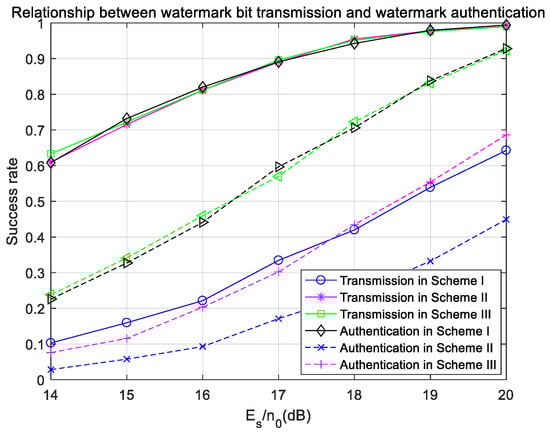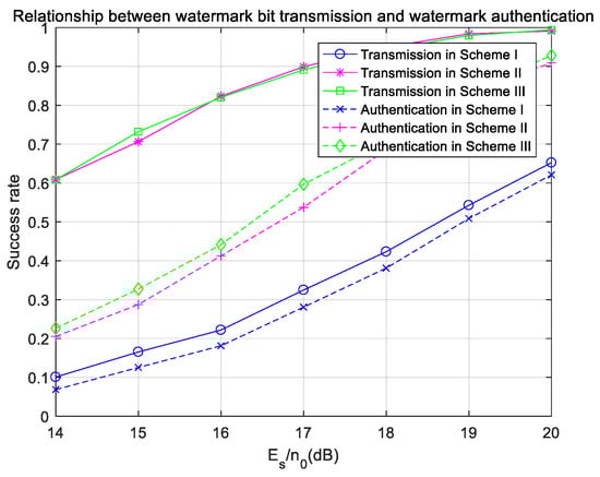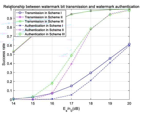Finally, the success rate of watermark-bit transmission and the success rate of watermark authentication are compared in Figure 19. The transmission success rate in Scheme I is much lower than those in Scheme II and Scheme III, and the authentication success rate in Scheme I is limited by the transmission success rate, because Scheme I does not carry out channel coding on the watermark bits. Scheme II and Scheme III have the same success rate of watermark transmission, but the authentication success rate in Scheme III is slightly higher than that in Scheme II, because Scheme III uses pseudo-user-bits instead of user bits as parameters to generate watermarks. The authentication success rate in Scheme II and Scheme III is limited by the success rate of user-data transmission.