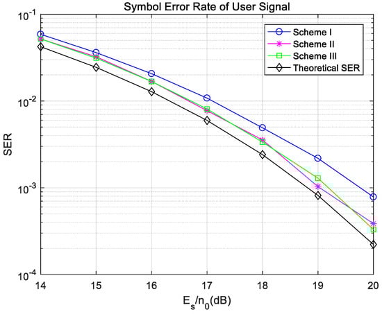 In Figure 17, the symbol error rates of user’s signal in Scheme II and Scheme III are consistent, and both are similar to the theoretical symbol error rate of 16QAM and lower than that in Scheme I. Compared with the theoretical symbol error rate of 16QAM, there is still a gap between the user’s signal error rates in Scheme II and Scheme III, because channel estimation of the DMRS is not completely accurate.