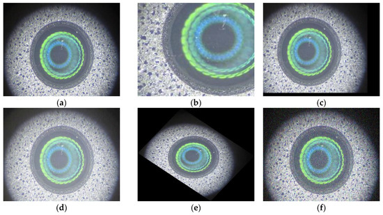 Camera module lens surface defect appearance. (a) White spots. (b) White dots. (c) Scratch. (d) Hair filaments. (e) Foreign objects. (f) Dirt.