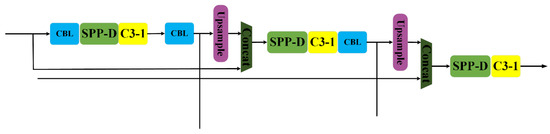 In order to reduce the feature information loss and improve the accuracy of small target detection, this paper improves the SPP module and proposes the SPP-D module, thus reducing the feature information loss caused by the maximum pooling of the SPP module. The structure of the module before and after the improvement is shown in Figure 7.