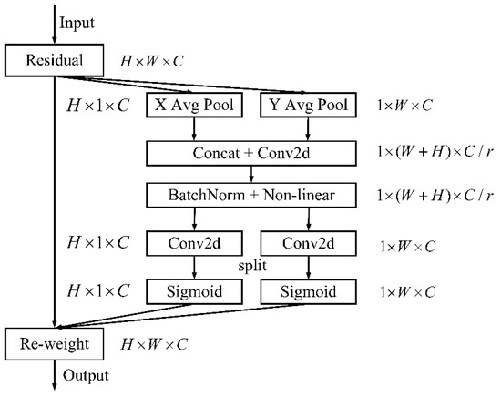 A convolution kernel of size is used to convolve the feature map to obtain the feature maps and with the same number of channels as the original one. Then, after the Sigmoid activation function, the attention weight in the height and the attention weight in the width direction are obtained. The specific calculation formula is shown in Equations (7) and (8):