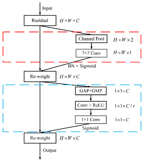 The specific structure of the CBAM convolutional attention mechanism module is shown in Figure 11. As can be seen from the figure, CBAM performs feature aggregation in both channel and spatial dimensions, and mainly consists of two sub-modules, the channel attention module and the spatial attention module, in which the red box is the channel attention mechanism module and the blue box is the spatial attention mechanism module [29].