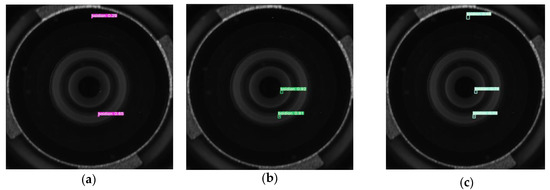 To analyze the impact of two improvement points of DAFS and DIoU-NMS on the detection results, some of the test results are visualized as shown in Figure 14. Figure 14a shows some of the detection results of the original YOLOv5s+DAFS, and it can be seen that the network has missed detection when the target is too small, and some of the detection frames are not very accurate. Figure 14b is the DIoU-NMS post-processing method obtained by improving the non-extremely suppressed post-processing method on the basis of (a), and the regression accuracy of the detection frame is significantly improved in the same image compared with Figure 14a, but the same problem of missed detection exists. Figure 14c shows the detection results with the CBAM module, and compared to Figure 14b, the missed white point defects are detected while maintaining a high detection accuracy.