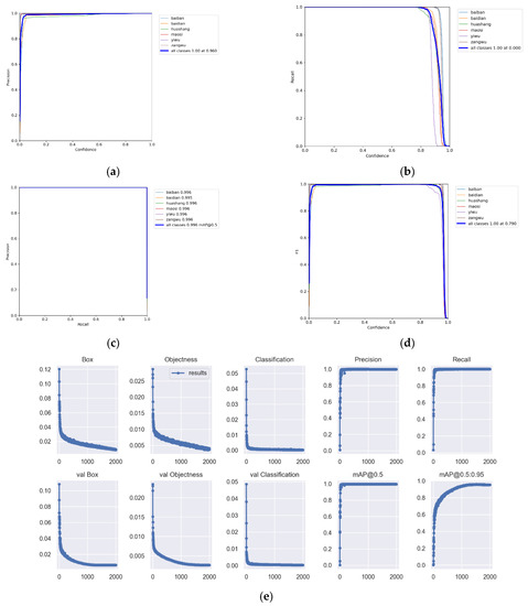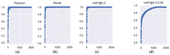 Figure 16 shows the results of each evaluation of the improved YOLOv5 model. After 2000 epochs, the model reaches the convergence state. During the training of the model, the precision and recall rate are improved very steadily. After the model reaches saturation, its precision rate, which is shown in Figure 16a, can be maintained steadily around 99%; the recall rate, shown in Figure 16b, can be maintained steadily around 100%. The mean average precision and the reconciled mean average precision also remain at a high level, and the mean average precision, as shown in Figure 16c, can be stably maintained around 99%; the reconciled mean average precision, as shown in Figure 16d, can be stably maintained around 0.96.