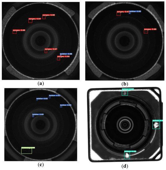 The best detection model obtained from the training have been used for the defect detection of camera module lens, and some of the detection results are shown in Figure 17. The detection accuracy of white spot defects is basically maintained at about 93%, and the detection accuracy of white spots, scratches and dirty defects is as high as 96%, and there is no leakage and false detection. Therefore, the test experiment has achieved relatively satisfactory results.