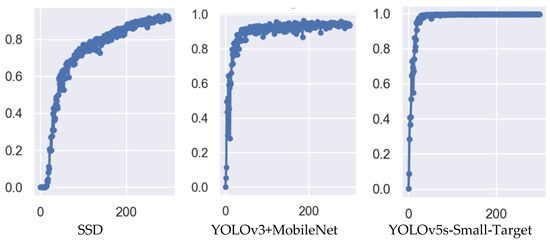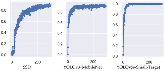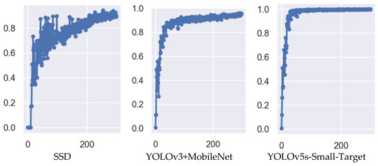 To further validate the testing effectiveness of the YOLOv5s-Small-Target algorithm used in this paper on camera module lens surface defect detection, it is compared with the single-stage SSD algorithm and the YOLOv3+MobileNet lightweight network. The number of model training is set to 300, the batch size is set to 8, and all three algorithms do not use pre-trained models. The specific experimental results are shown in Figure 18, Figure 19, Figure 20 and Figure 21.